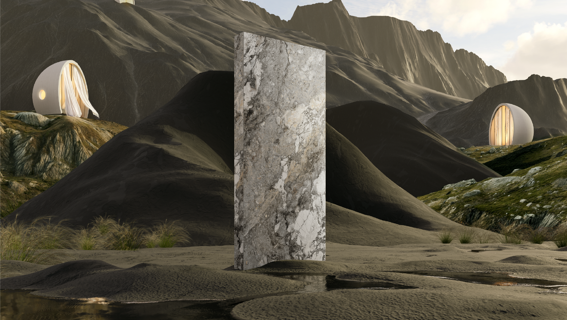 Slabs de Gran Escala de 120x280 cm que crean superficies que fluyen, envolviendo los espacios con una presencia casi intangible.
