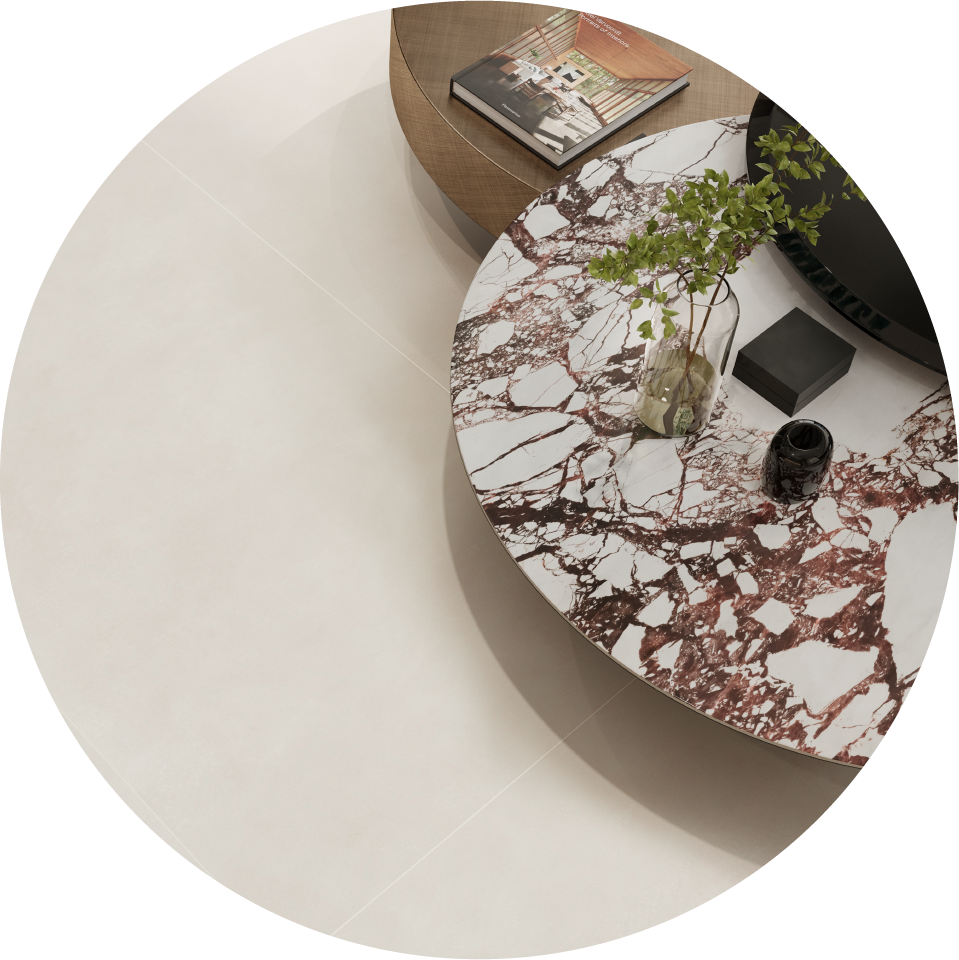 Se inspira en el travertino con vetas delicadas sobre un fondo cálido y matices de color arena. Este material clásico se reinventa para adaptarse a contextos contemporáneos, fusionando la elegancia tradicional con una perspectiva moderna.