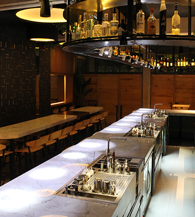 La barra principal, extensa y protagónica, articula la espacialidad. Cada asiento está iluminado con luz puntual dirigida hacia la bebida, destacando a las creaciones líquidas como el verdadero personaje central. La iluminación cálida y controlada enfatiza el carácter íntimo y sofisticado del lugar.