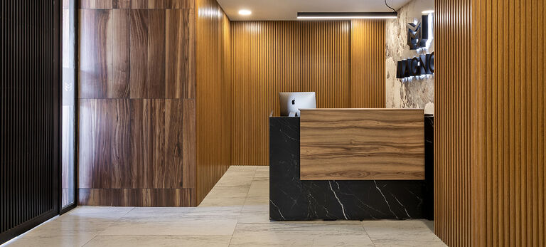 Magno Corporativo tiene un toque sofisticado y sobrio para quienes depositan su confianza al momento de hacer negocios. La cerámica utilizada en la fachada a manera de piel es de la marca Interceramic, dando calidez y modernidad al edificio que en contraste con el material cerámico hace un equilibrio interesante y atemporal. Su diseño de fachada con estructura modulada en marca diferentes acabados tipo de madera y metal logrando un equilibrio y reinterpretación de sus aspectos más destacables su calidez y atención envuelta en su experiencia y profesionalismo.
