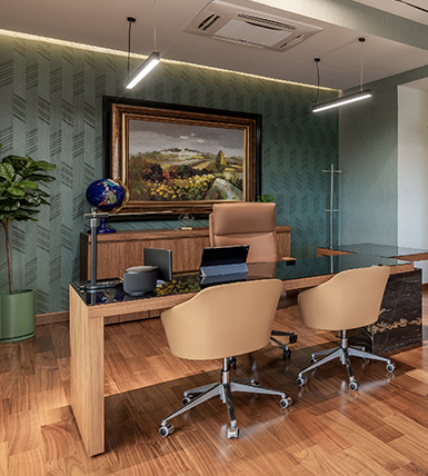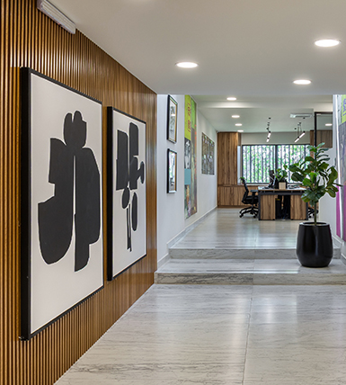 Por ello sus espacios interiores fueron intervenidos para otorgar espacios amplios con ventanas que permitieran aprovechar al máximo la luz solar en diferentes áreas de trabajo, logrando una experiencia de espacios amplios a través de diversas áreas de trabajo con acabados en madera, cerámica con tipo mármol y piedra, otorgando un espacio neutro con diferentes acentos de color que enriquecen el espacio acorde a su usuario y fin.