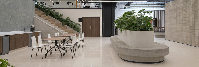 En el núcleo del edificio, una escalinata central se concibe como un espacio de encuentro y foro abierto, promoviendo el intercambio informal y la interacción entre los usuarios. La combinación de espacios cerrados y abiertos, junto con el uso de materiales como concreto, madera y celosías, refuerza el carácter institucional sin perder flexibilidad funcional.