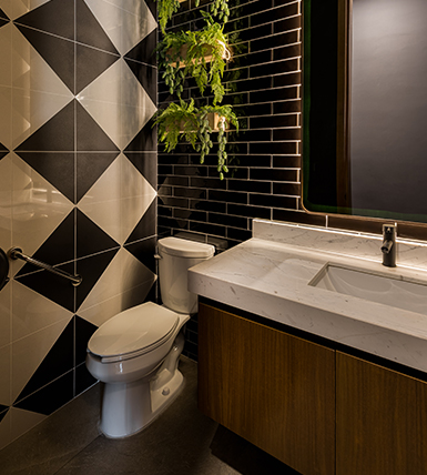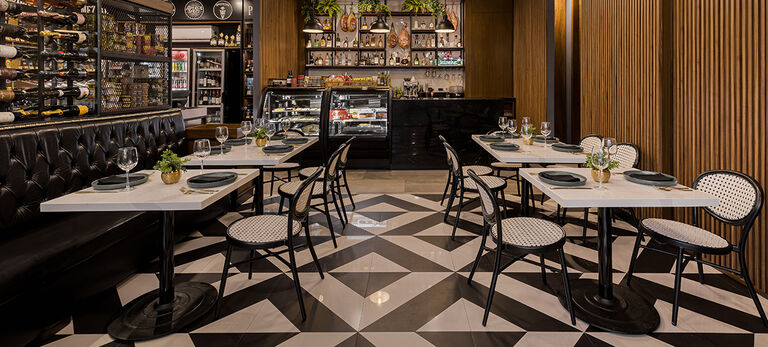 El diseño parte de una paleta de contrastes: pisos en blanco y negro con patrones geométricos de gran formato -proporcionados por Interceramic- marcan una identidad grafica que dinamiza el recorrido visual y enfatiza la geometría del espacio.