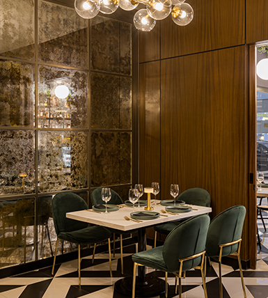 La madera natural se integra en muros y mobiliario como elemento de equilibrio y calidez, mientras que el uso del verde en tapicería como en vegetación suspendida, hace una remembranza al paisaje tabasqueño y le da vida al interior, convirtiéndose en parte esencial del concepto sensorial del lugar.